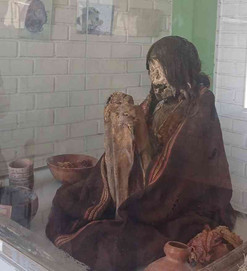 Sous des appentis disséminés sur l'immense site, nous découvrons, creusés d'environ 2 mètres dans le sol, des cavités carrées entourées de murs en adobe... et posées au fond, comme assises en position fœtale, des momies avec de long cheveux... très longs cheveux qui s'enroulent autour d'elles... Le choc !
